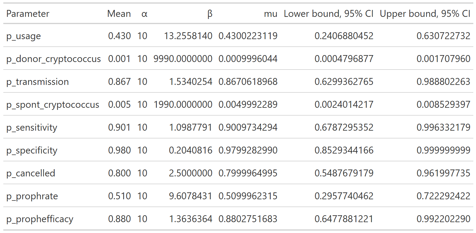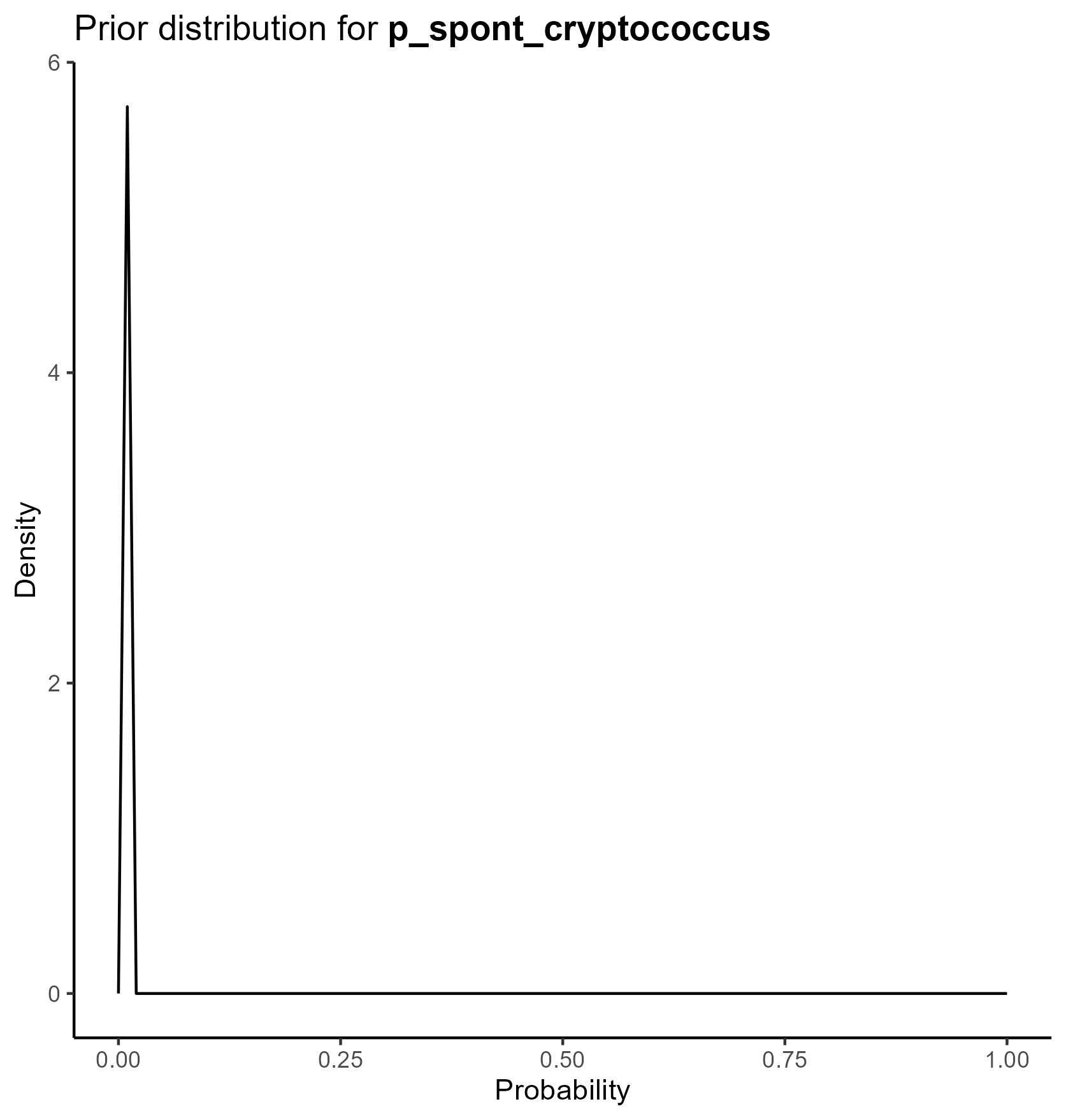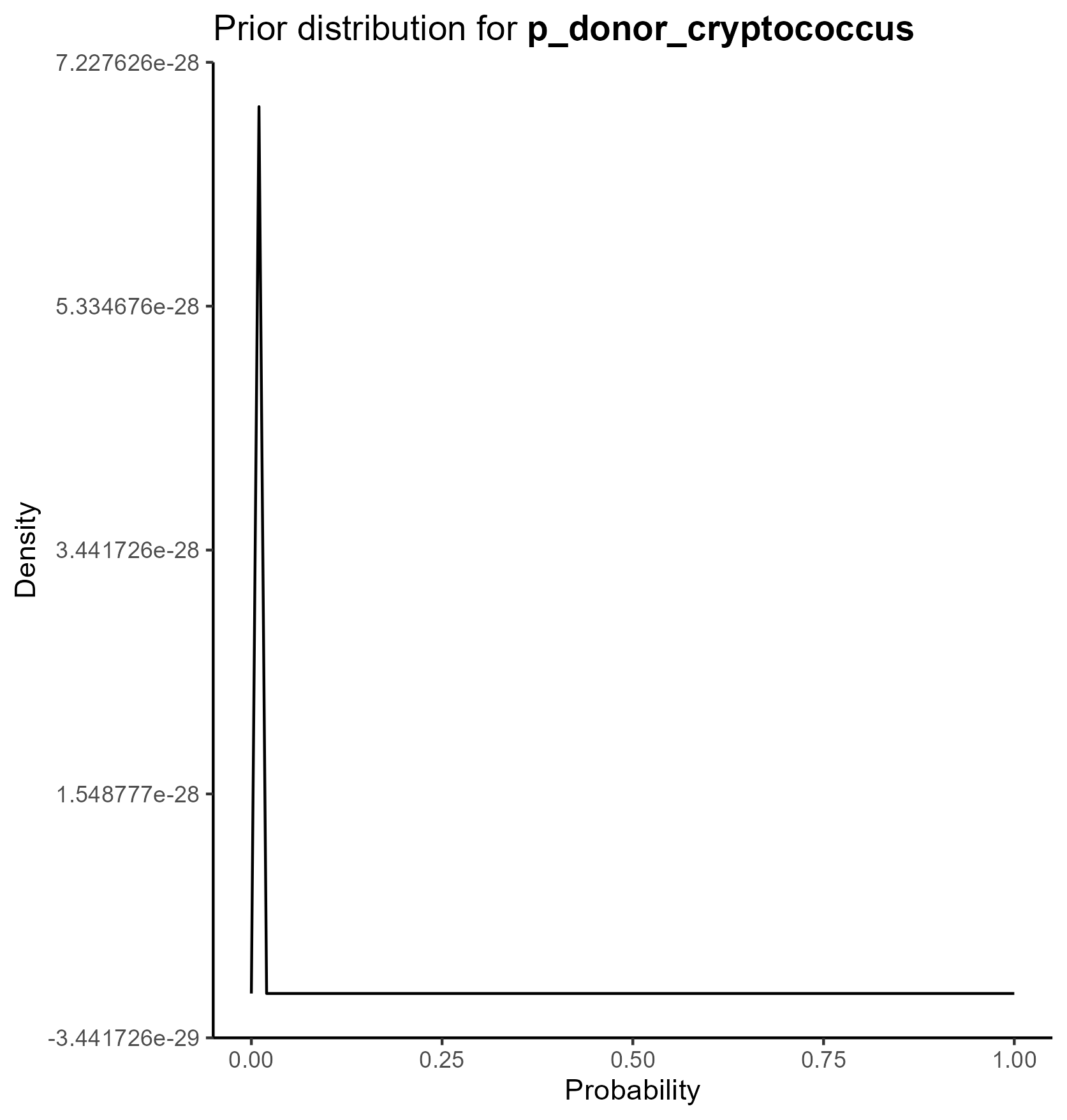 Instead of assigning a single fixed value to each model input (for example, “the probability of cryptococcal transmission is X%”), PSA allows each uncertain parameter to vary across a plausible range based on the available evidence. For each parameter, we specify a prior probability distribution that reflects how uncertain we are about its true value.