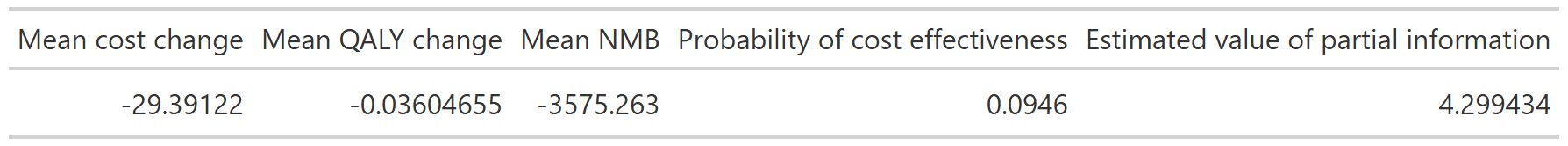 #First, we create the dataset with the simulated values#Extract values from abovePSA_simulation<-list()PSA_simulation$probabilities <- PSA_parameters$probabilities %>%transmute(draws = purrr::map2(shape1, shape2, ~rbeta(nsim, .x, .y)) ) %>%pull(draws) %>% rlang::set_names(PSA_parameters$probabilities$parameter) %>%as_tibble()PSA_simulation$costs<-PSA_parameters$costs %>%transmute(draws = purrr::map2(shape, scale, ~rgamma(nsim, shape=.x, scale=.y)) ) %>%pull(draws) %>% rlang::set_names(PSA_parameters$costs$parameter) %>%as_tibble()%>%mutate(cost_cancellation=0,cost_nocryptococcus=-10,cost_nonacceptance=0)PSA_simulation$qalys<-PSA_parameters$qalys %>%transmute(draws = purrr::map2(shape, scale, ~rgamma(nsim, shape=.x, scale=.y)) ) %>%pull(draws) %>% rlang::set_names(PSA_parameters$qalys$parameter) %>%as_tibble()%>%mutate(q_noacceptance=0)#Combine into a single tibblePSA_simulation<-bind_cols(PSA_simulation)%>%#Add derived quantitiesmutate(p_nonusage=1-p_usage,p_donor_nocryptococcus=1-p_donor_cryptococcus,p_nontransmission=1-p_transmission,p_nospont_cryptococcus=1-p_spont_cryptococcus,p_falsenegative=1-p_sensitivity,p_falsepositive=1-p_specificity,p_nocancelled=1-p_cancelled,p_noprophrate=1-p_prophrate,p_noprophefficacy=1-p_prophefficacy,p_breakthrough_donorpos=(1-p_prophefficacy)*p_transmission,p_nobreakthrough_donorpos=1-p_breakthrough_donorpos,p_breakthrough_donorneg=(1-p_prophefficacy)*p_spont_cryptococcus,p_nobreakthrough_donorneg=1-p_breakthrough_donorneg,q_cryptococcus=q_nocryptococcus-q_loss_cryptococcus)%>%#Calculate costs and QALYsrowwise() %>%mutate(results=list(calculate_cost_QALY_QC(p_usage=p_usage, p_donor_cryptococcus=p_donor_cryptococcus, p_transmission=p_transmission,p_spont_cryptococcus=p_spont_cryptococcus,p_sensitivity=p_sensitivity,p_specificity=p_specificity,p_cancelled=p_cancelled,p_prophrate=p_prophrate,p_prophefficacy=p_prophefficacy,cost_test=cost_test,cost_disease=cost_disease,cost_fluconazole=cost_fluconazole,cost_cancellation=cost_cancellation,cost_nocryptococcus=cost_nocryptococcus,cost_nonacceptance=cost_nonacceptance,q_nocryptococcus=q_nocryptococcus,q_noacceptance=q_noacceptance,q_loss_cryptococcus=q_loss_cryptococcus )))%>%ungroup()PSA_simulation_unnested<-PSA_simulation%>%unnest(results)%>%mutate(cost_change=total_expected_cost_s-total_expected_cost_ns,qaly_change=total_expected_qaly_s-total_expected_qaly_ns)%>%mutate(icer=cost_change/qaly_change)%>%mutate(nmb = wtp * qaly_change - cost_change )#Calculate the 95% ellipsePSA_min_df <- PSA_simulation_unnested %>%select(qaly_change, cost_change)# Create mu and sigma vectors for ellipseellipse_mu <-colMeans(PSA_min_df)ellipse_Sigma <-cov(PSA_min_df)# Generate ellipse pointsellipse_df <-as.data.frame(ellipse( ellipse_Sigma,centre = ellipse_mu,level =0.95,npoints =200 ))colnames(ellipse_df) <-c("qaly_change", "cost_change")#Create PSA plotPSA_plot<-PSA_simulation_unnested%>%ggplot()+geom_point(mapping =aes(x=qaly_change, y=cost_change), alpha=0.1)+geom_path(data = ellipse_df,color ="red",mapping =aes(x=qaly_change, y=cost_change),linewidth =1 )+geom_hline(yintercept =0, linewidth =0.4, color ="black")+geom_vline(xintercept =0, linewidth =0.4, color ="black")+coord_cartesian(xlim =c(-1.5, 1.5),ylim =c(-300, 300))+theme_classic()+theme(plot.title =element_text(hjust =0.5) )+labs(title ="Probabilistic sensitivity analysis",x="QALY change",y="Cost change" )ggsave("figures/PSA_plot.svg")PSA_plot
