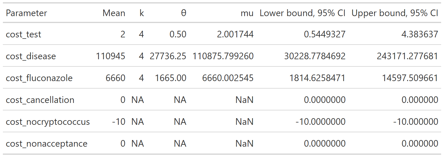 We chose values of \(k\) and \(\theta\) which yield the mean from the base case analysis and confidence intervals consistent with prior literature.