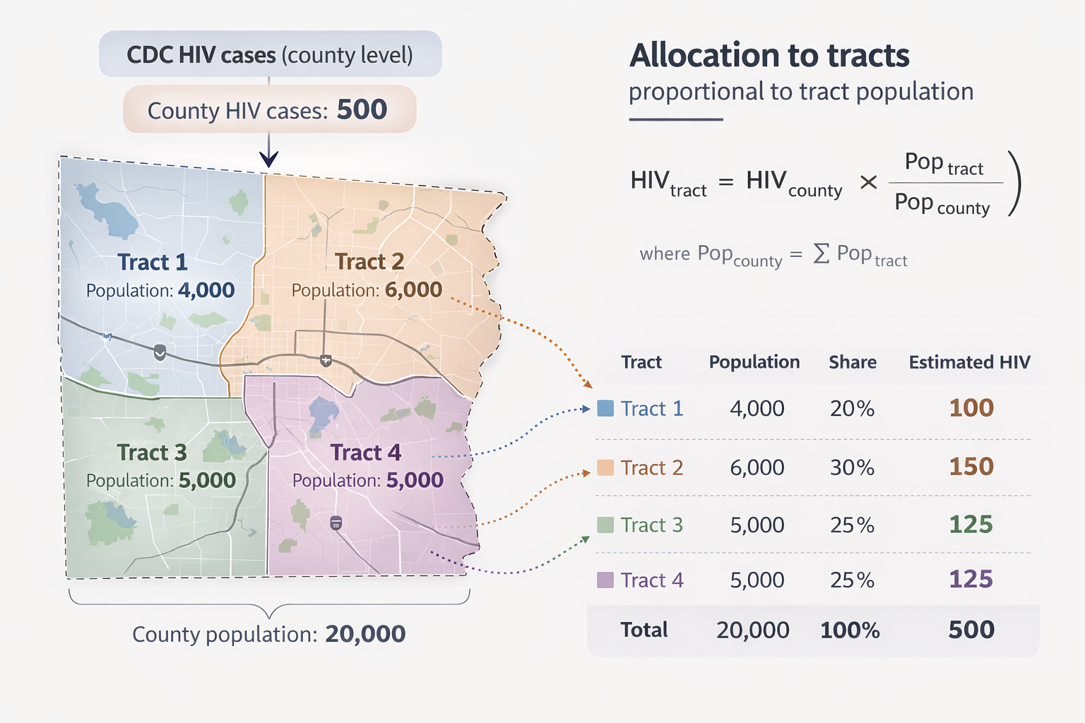 Extrapolation of county HIV population to the census tract level
