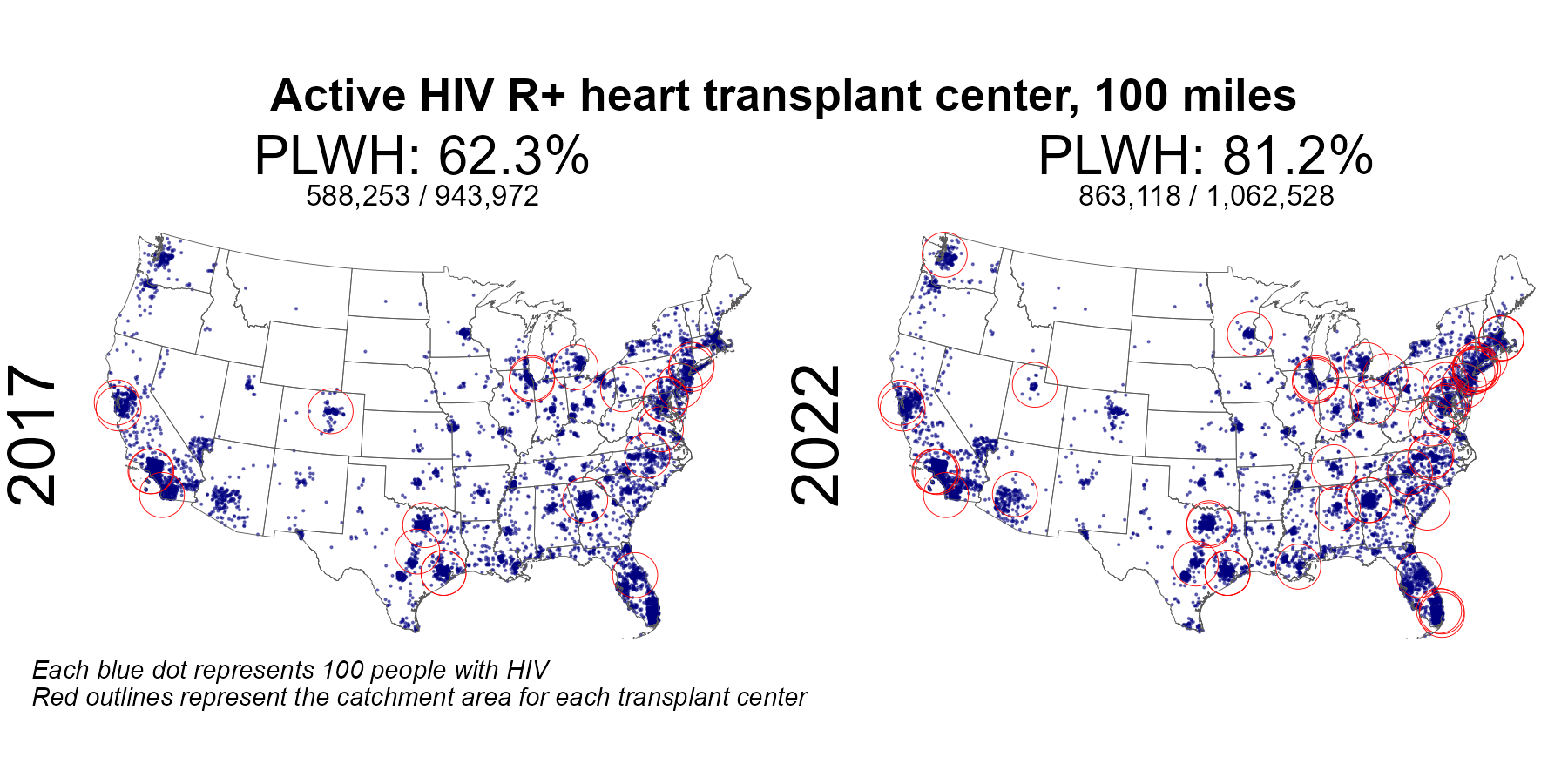 | Active HIV R+ heart center 100 mile radius | 588,253 | 943,972 | 62.3 | 863,118 | 1,062,528 | 81.2 |