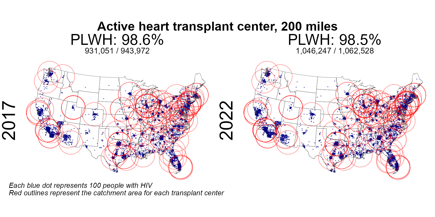These figures evaluate changes in geographic access among PLWH between 2017 and 2022.