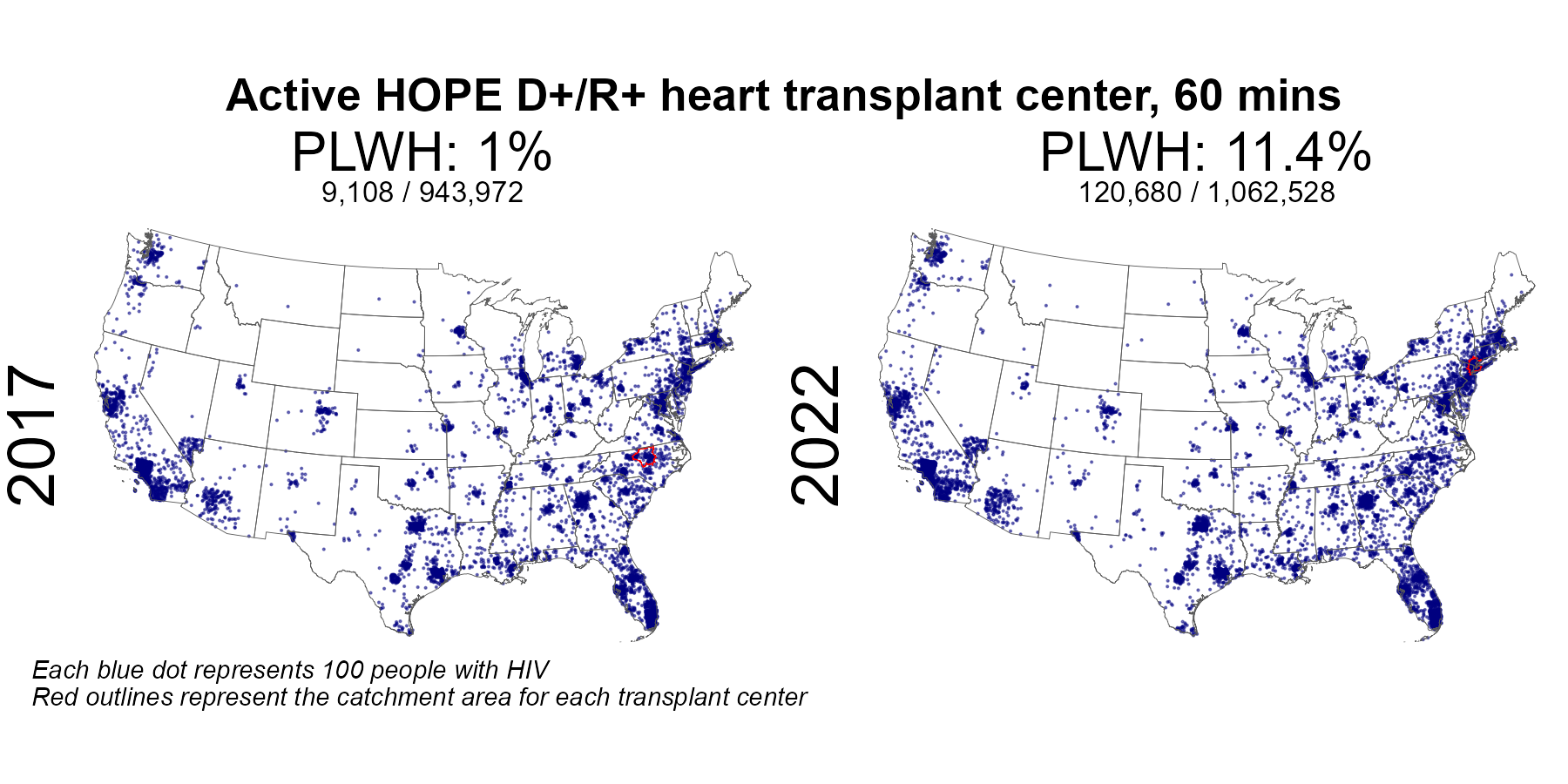 | Active HIV R+ heart center 60 min radius | 452,075 | 943,972 | 47.9 | 684,798 | 1,062,528 | 64.4 |