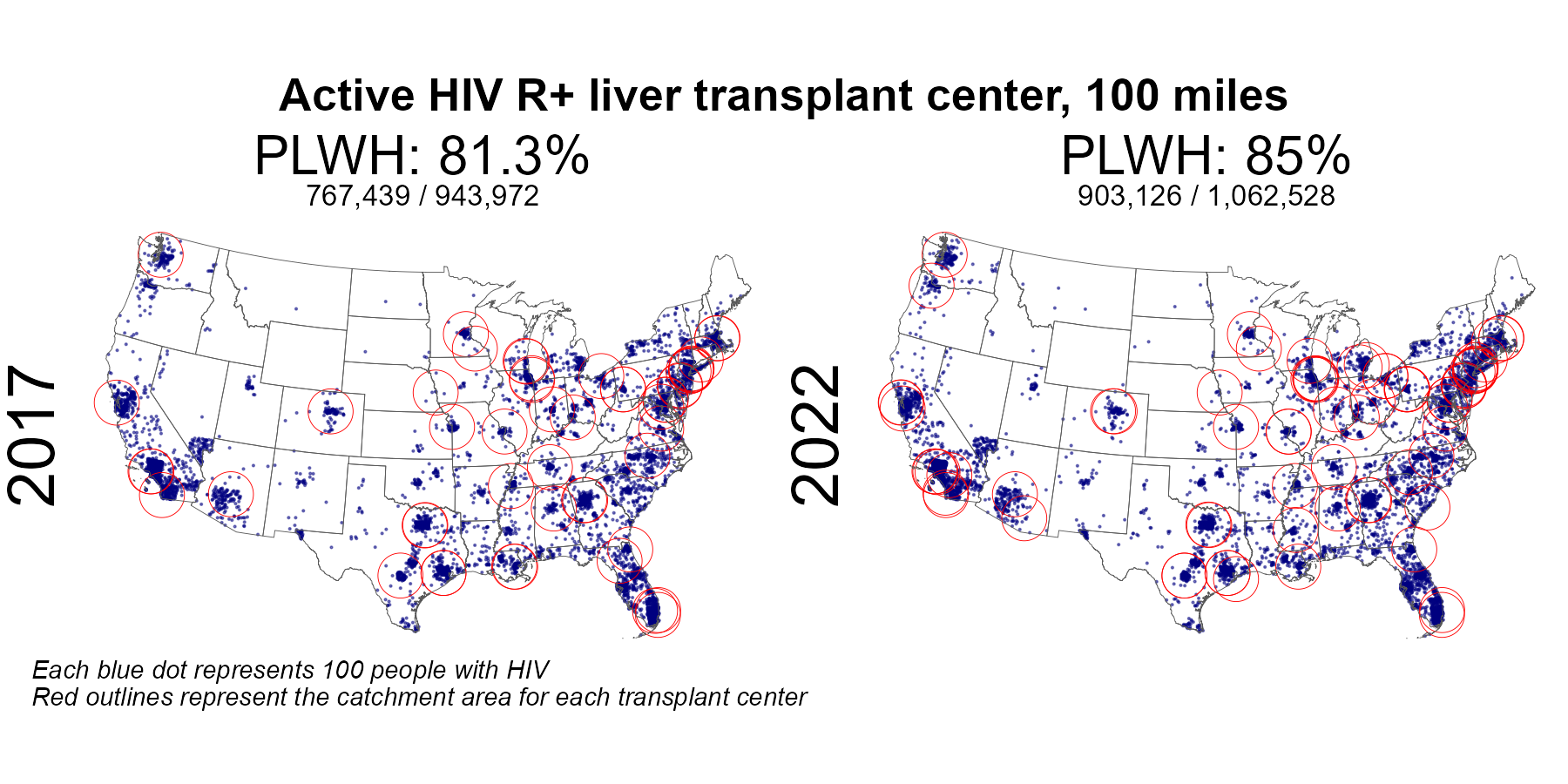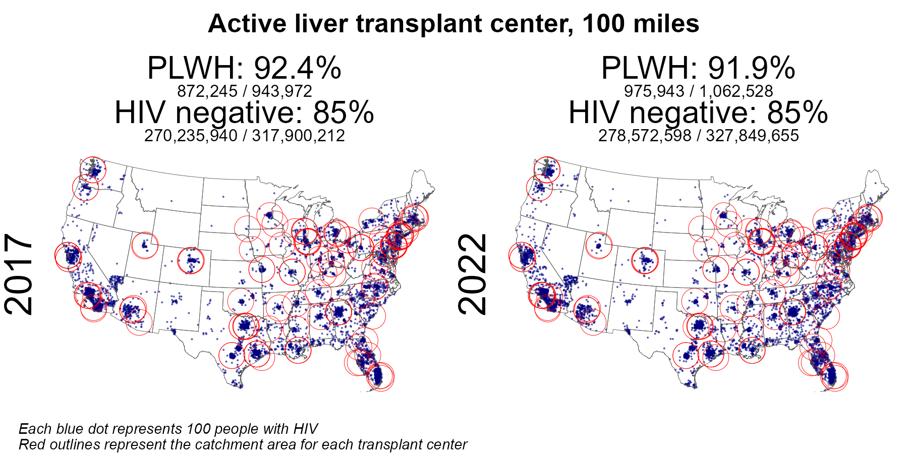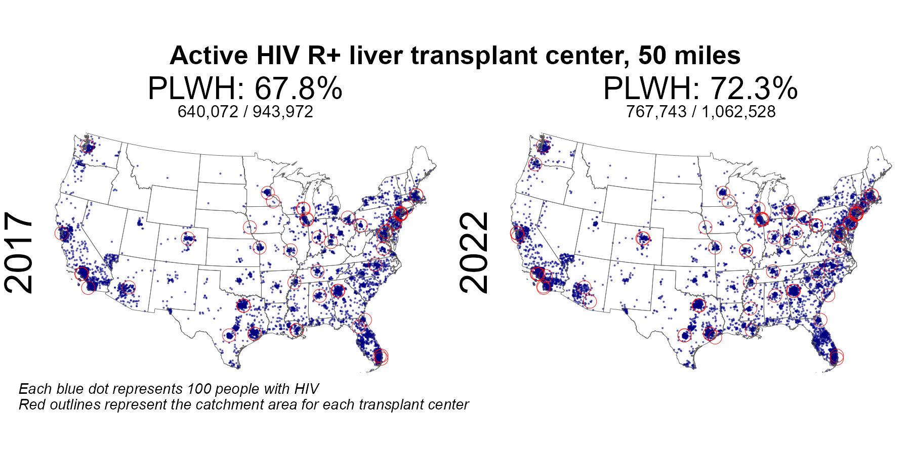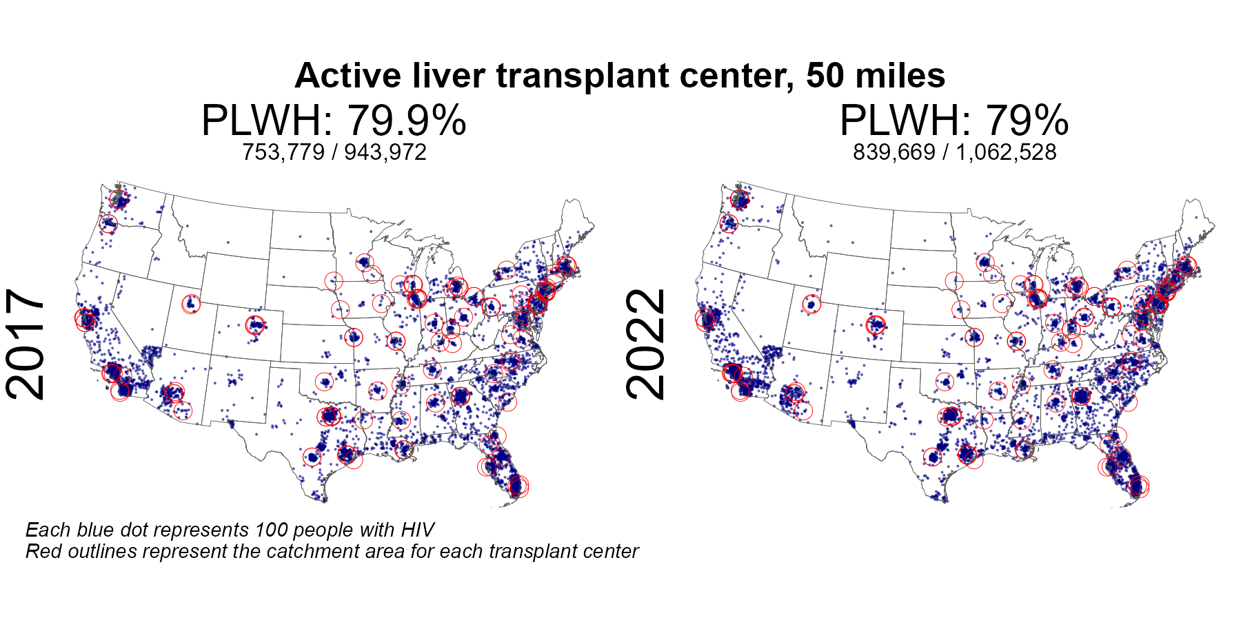 | Active HIV R+ liver center 50 mile radius | 640,072 | 943,972 | 67.8 | 767,743 | 1,062,528 | 72.3 |