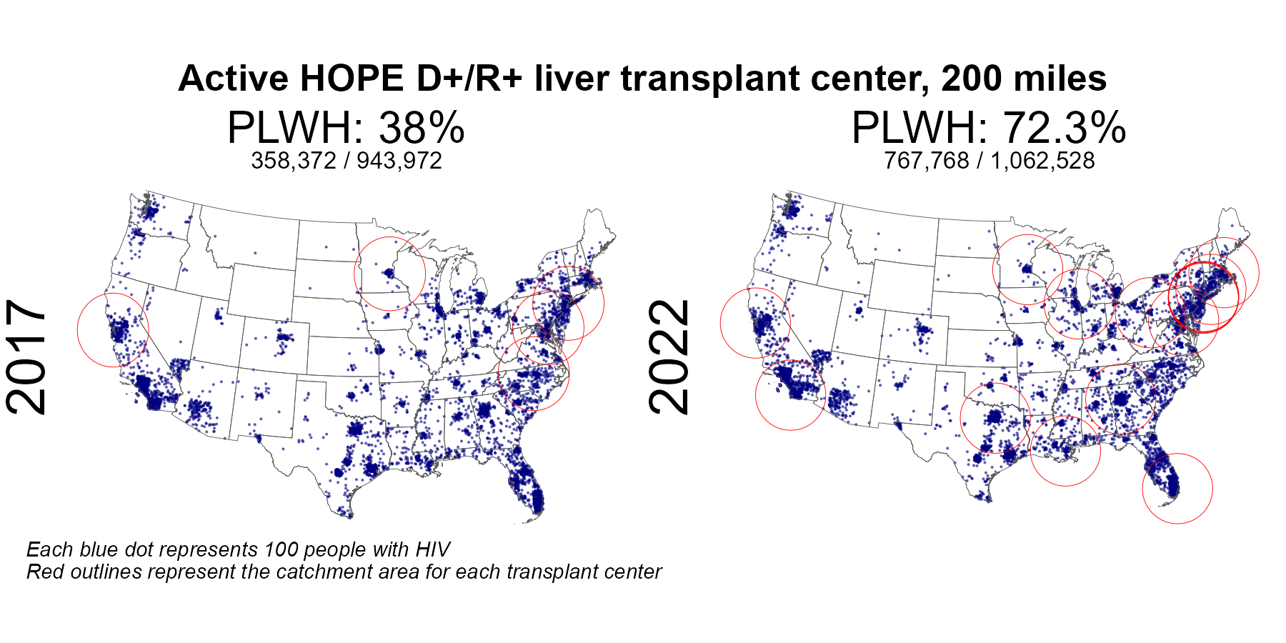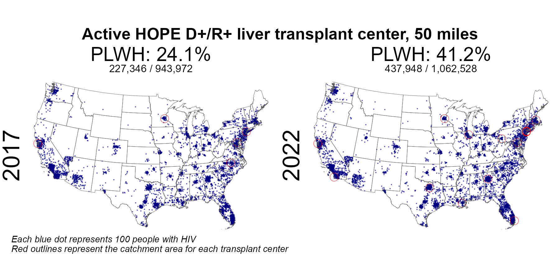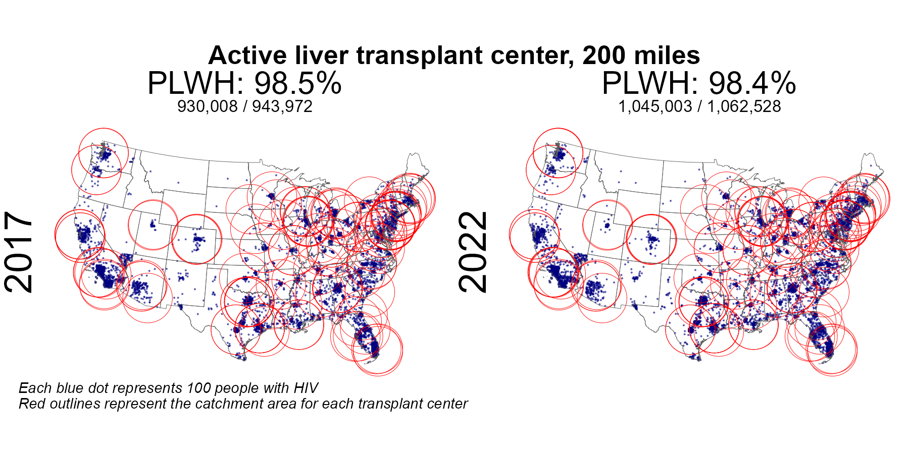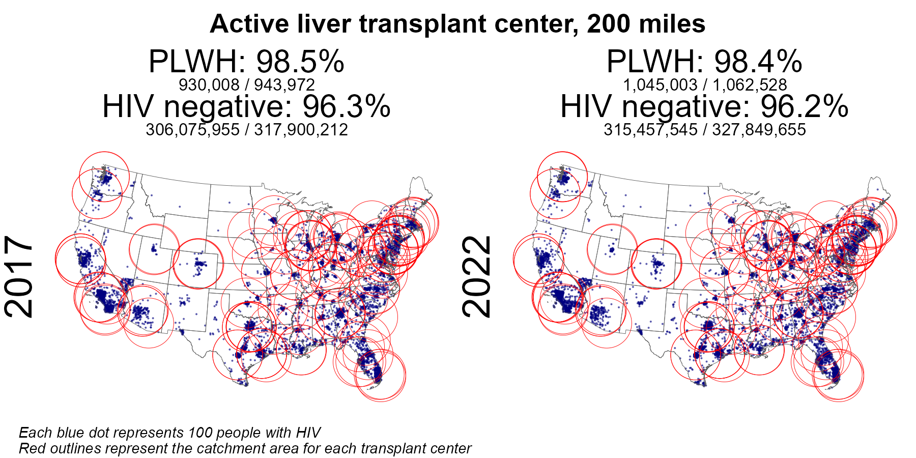 | Active HIV R+ liver center 50 mile radius | 640,072 | 943,972 | 67.8 | 767,743 | 1,062,528 | 72.3 |