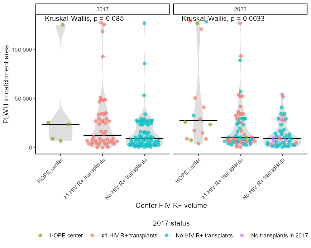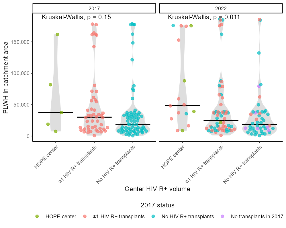 Each point represents a transplant center, with the distribution shown for each distance definition.