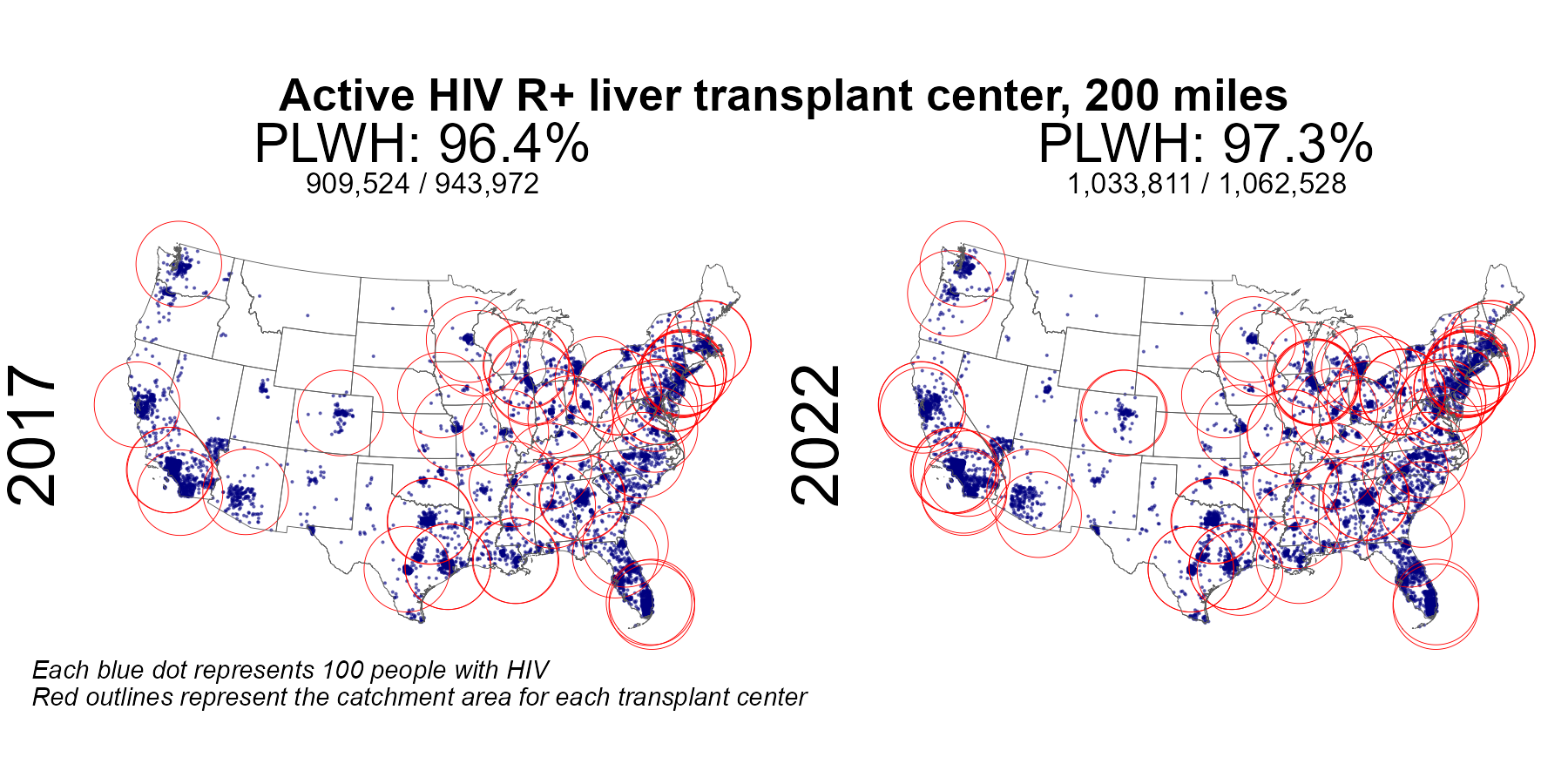 | Active HIV R+ liver center 200 mile radius | 909,524 | 943,972 | 96.4 | 1,033,811 | 1,062,528 | 97.3 |